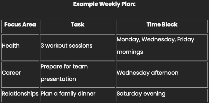 At the start of each week, identify 1-2 key tasks for each focus area. Allocate time blocks to work on these tasks.
